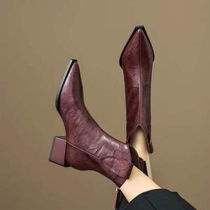 安可拉红2025新款秋冬马丁靴高跟裸靴尖头气质棕色粗跟英伦短靴女