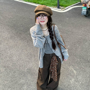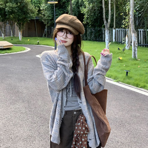 韩系早秋季穿搭灰色镂空外套重工破边设计感外搭上衣针织衫开衫女