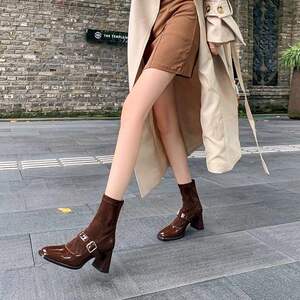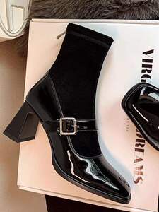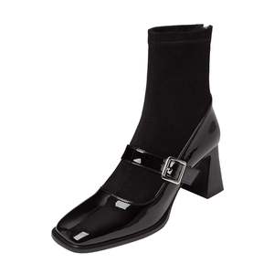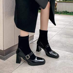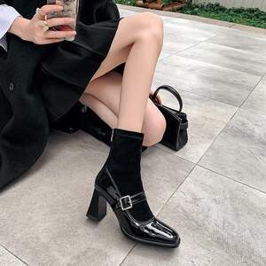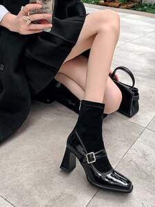 弹力瘦瘦法式高跟瘦瘦靴女黑色漆皮弹力靴粗跟复古方头玛丽珍短靴