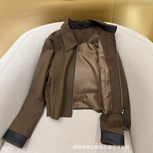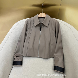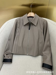 25早秋新款极简风精纺棉拼接真皮拉链长袖百搭短款气质外套女上衣