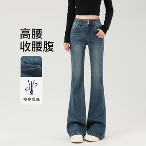 高腰微喇牛仔裤女秋2025新款小个子弹力修身复古深蓝色显瘦喇叭裤