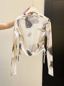 设计感短款小众T恤长袖双侧抽绳收腰显瘦网纱上衣扎染防晒罩衫