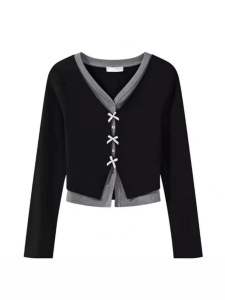 2025假两件撞色领长袖开衫女早秋修身显瘦休闲拼接百搭短款上衣