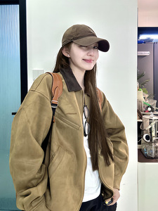 秋季撞色翻领外套女2025新款复古麂皮绒宽松休闲短款情侣夹克上衣