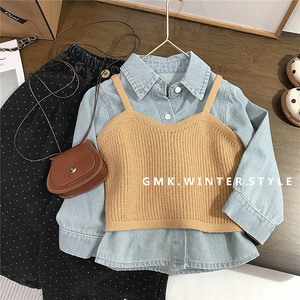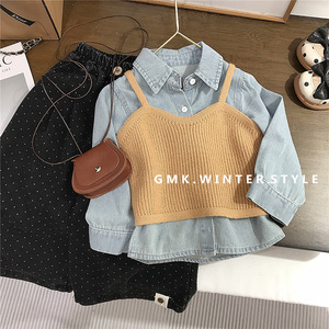 女童韩版套装秋季新款儿童装吊带牛仔衬衫小女孩时髦叠穿衬衣外贸
