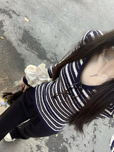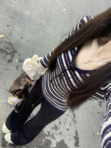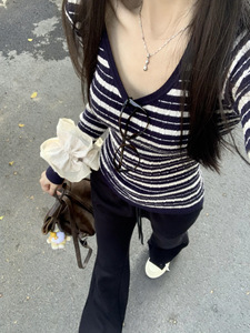蓝白条纹V领针织衫女2025秋新款美式复古修身显瘦短款套头上衣