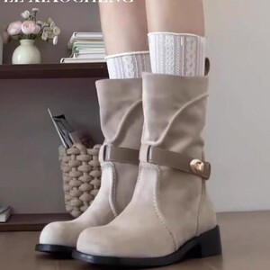 法式复古马丁靴女2025新款粗跟短靴皮带扣显瘦时装靴绒面中筒靴子