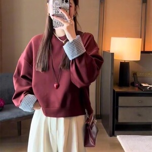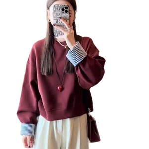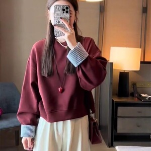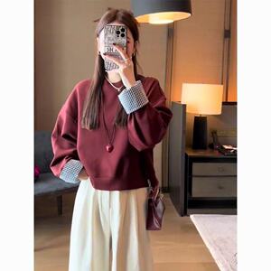 韩版设计感假两件拼色格子长袖卫衣女秋季新款宽松慵懒上衣潮