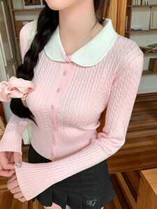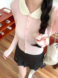 粉色娃娃领长袖针织衫女装秋冬收腰短款软糯外穿百搭打底甜美上衣