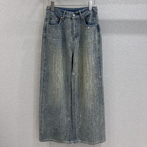 烫钻满天星设计牛仔裤女 复古做旧风显瘦百搭高腰阔腿长裤ZK63398