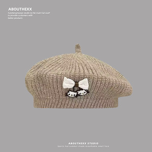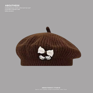 蝴蝶结猫咪针织贝雷帽-咖啡