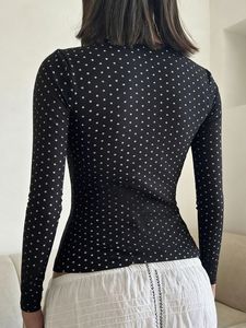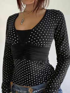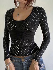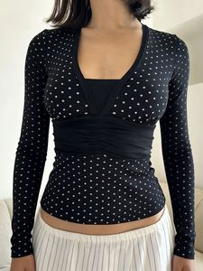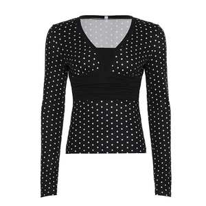 美式辣妹u领气质修身低胸长袖假两件波点T恤新款收腰纯色时尚上衣