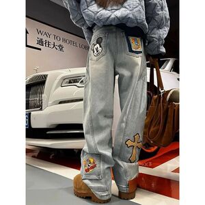 美式复古刺绣弯刀牛仔裤女2025新款宽松显瘦百搭香蕉阔腿长裤子潮