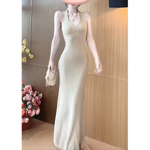 2025秋季新款挂脖气质收腰长裙打底连衣裙长袖外套无胸垫针织开衫