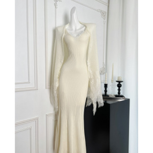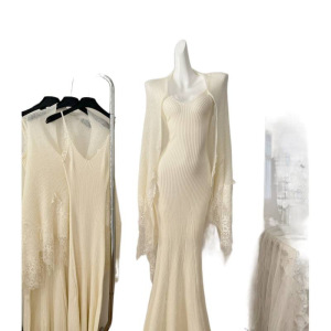 2025短剧同款归国白月光新中式蕾丝拼接马海毛披肩吊带连衣裙套装