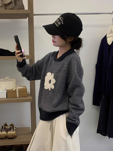 韩系chic复古条纹翻领针织衫女2025新款秋季巨好看慵懒风软糯上衣