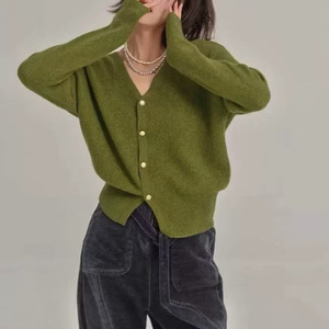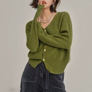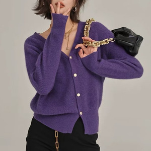 优雅气质紫色v领浣熊绒毛衣外套女秋冬宽松慵懒针织开衫短款上衣