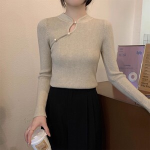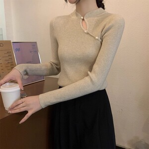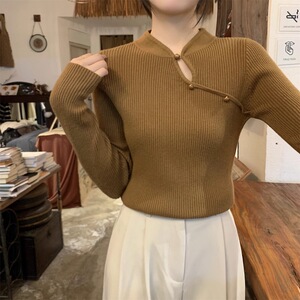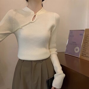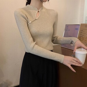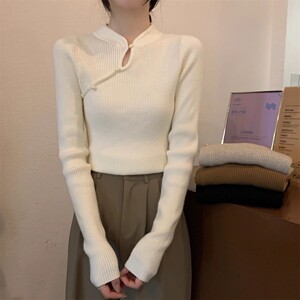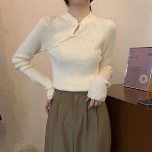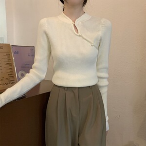 2025秋冬新款设计感国风半高领毛衣女盘扣新中式紧身内搭打底上衣