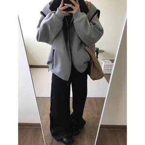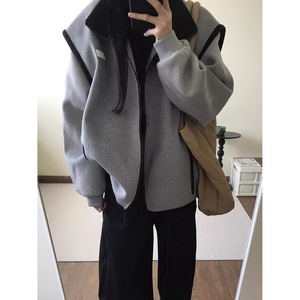 美式复古灰色拼接毛呢外套男女春秋休闲宽松百搭廓形棒球服上衣潮