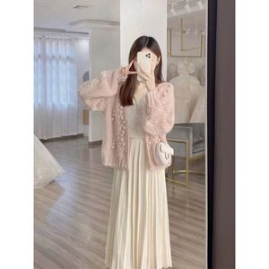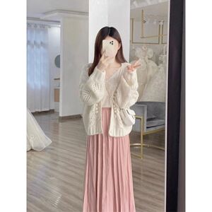 奶系穿搭粉色镂空马海毛毛衣外套开衫女春秋慵懒风上衣软糯针织衫