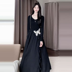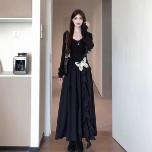 早秋2025新款高级感蝴蝶裙小黑裙不规则裙边纯色长袖连衣裙收腰女