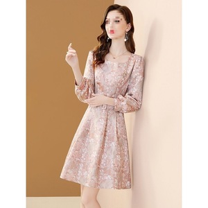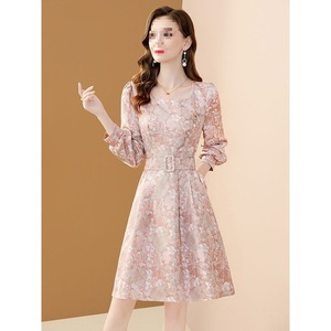 高端轻奢名媛提花连衣裙女秋2025新款气质方领收腰显瘦减龄中长裙