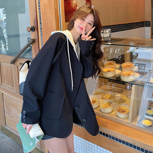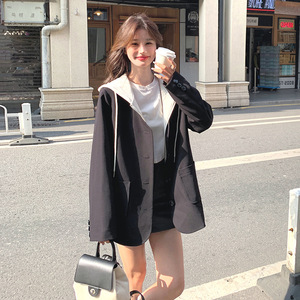 实拍连帽西装外套女春季韩系高级感休闲宽松设计感假两件短款上衣