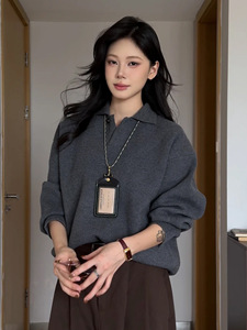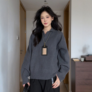 深灰慵懒破裁毛衣女装 百搭宽松简约V领毛衫尤缇时尚秋季新款