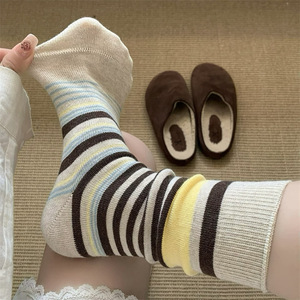 美拉德撞色条纹中筒袜子女韩版复古森系透气秋冬勃肯鞋双针堆堆袜