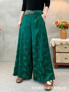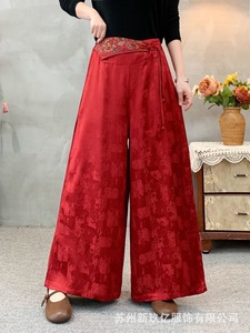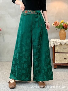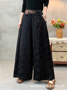 2025新款松紧腰大码显瘦休闲裤女民族风复古刺绣缎面提花阔腿裤