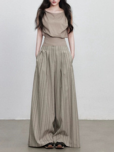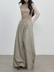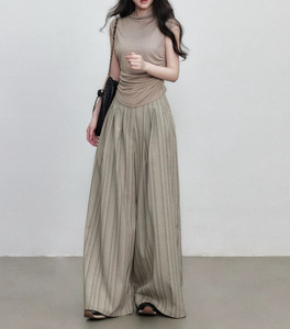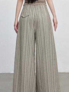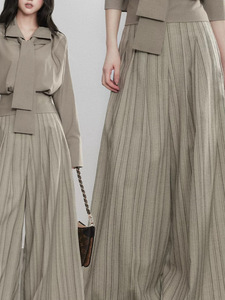 通勤感条纹阔腿裤秋季新款褶皱设计休闲百搭直筒长裤女