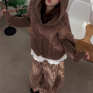 美式复古麻花连帽毛衣开衫女2025秋冬慵懒风针织衫女上衣外套ins