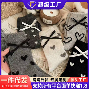 灰色爱心蝴蝶结针织袜子女中筒袜秋冬季加绒加厚保暖毛绒冬天长袜