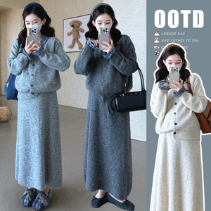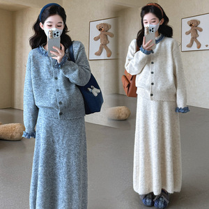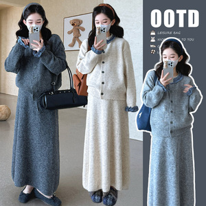 2025秋冬孕妇套装韩版时尚针织毛衣加厚拼接上衣+半身裙两件套
