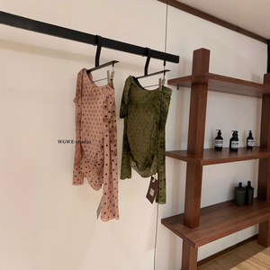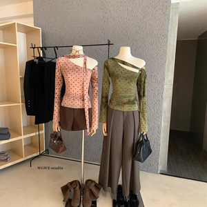 WGWE7229#博主推荐美美自留欲欲薄感波点网纱斜肩绑带长袖T恤