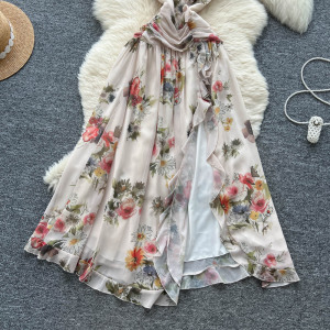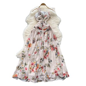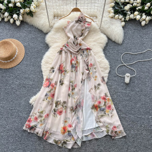 氛围感立体花朵挂脖斜肩吊带连衣裙女法式纯欲收腰气质开叉碎花裙