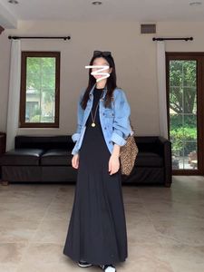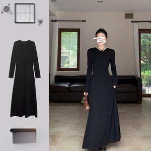 法式赫本风黑色裙长袖连衣裙女春秋时尚感遮肚子a字长裙子打底裙