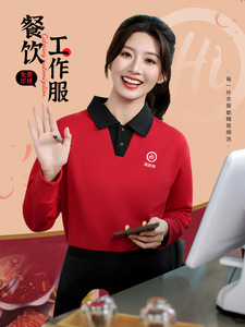 新款棉质餐饮服务员工作服长袖外套印logo火锅店烧烤店奶茶店工衣