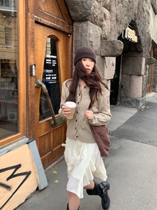 pusumede 秋日部落 圆领麻花毛衣开衫女长袖针织衫外套气质上衣