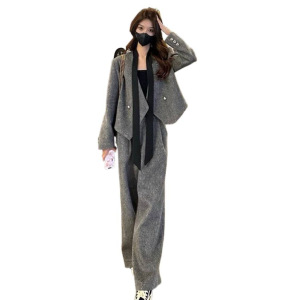 时尚感V领飘带毛呢西装外套女秋休闲直筒裤秋冬新款两件套装