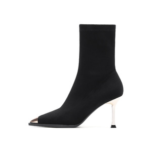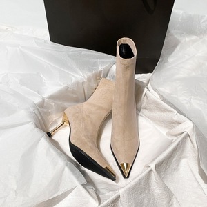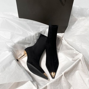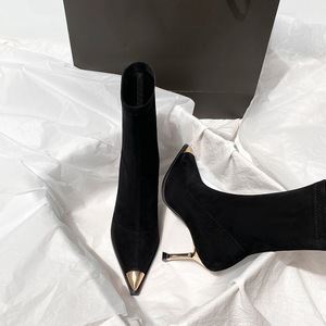 西施金属头黑色靴子女2025年秋冬新款尖头绒面高跟短靴瘦瘦靴细跟