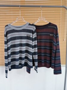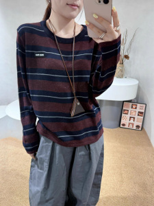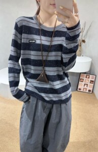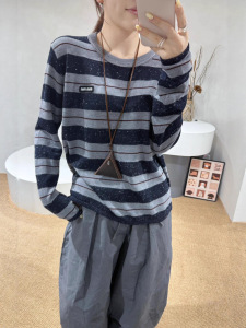 现货MIU系雪花棉条纹罩衫长袖圆领上衣宽松休闲慵懒感条纹上衣女