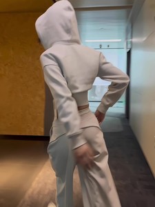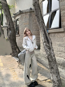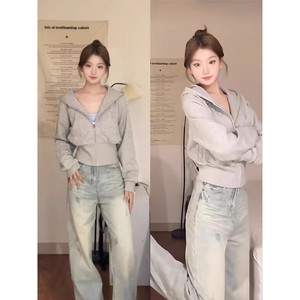 白灰色短款卫衣外套2025早秋新款连帽开衫美式辣妹运动休闲上衣