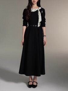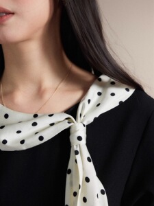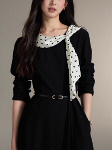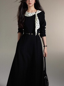 贰羊设计南艺法式气质波点飘带领拼黑色连衣裙女高级感收腰裙