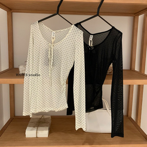 WGWE7225波点蝴蝶结t恤韩系长袖罩衫修身上衣