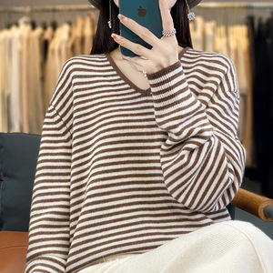 100纯羊毛衫女式V字领套头毛衣秋冬新款针织长袖内搭简约条纹提花