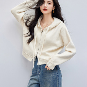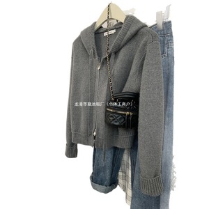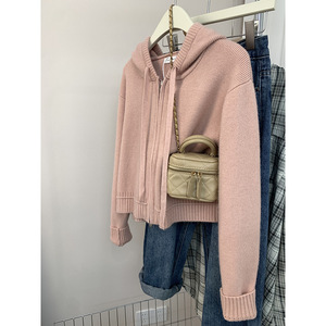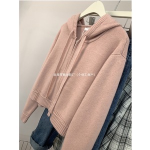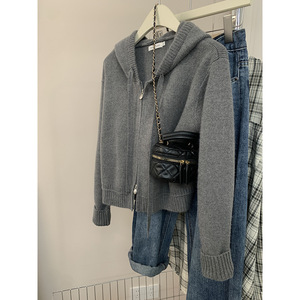 韩系设计感双拉链连帽短款针织开衫女2025秋冬季毛衣外套慵懒上衣
