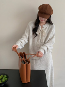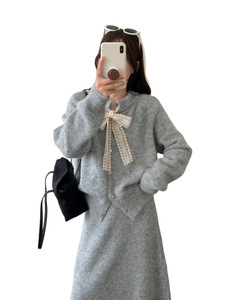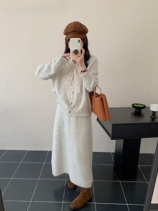 蕾丝系带开衫+半身裙高档两件套2025秋冬新款羊驼绒高质量套装裙