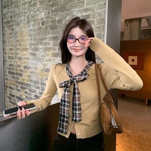 韩系格子蝴蝶结长袖针织开衫女秋冬毛衣设计感修身辣妹假两件上衣
