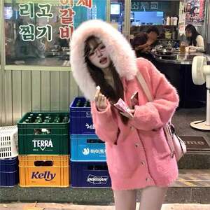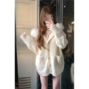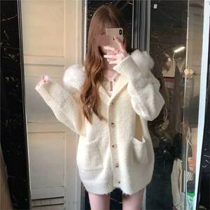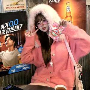 小香风毛毛领连帽毛衣外套女慵懒风宽松秋冬季新款针织开衫上衣